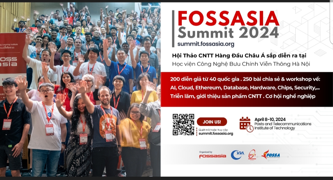 “Hội nghị thượng đỉnh về công nghệ thông tin và mã nguồn mở châu Á - FOSSASIA Summit 2024” khai mạc sáng nay (8/4) tại Hà Nội. Sự kiện được tổ chức bởi FOSSASIA (Tổ chức hỗ trợ các nhà phát triển và nhà hoạch định về công nghệ nguồn mở), Hiệp hội Internet Việt Nam (VIA), Học viện Công nghệ bưu chính viễn thông (PTIT) và Câu lạc bộ phần mềm tự do nguồn mở Việt Nam (VFOSSA).