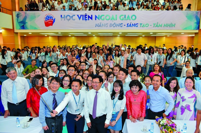 Phó Thủ tướng, Bộ trưởng Ngoại giao Phạm Bình Minh cùng các giảng viên, sinh viên Học viện Ngoại giao nhân dịp khai giảng năm học 2016-2017. |