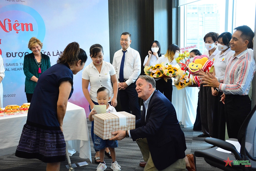 Ban tổ chức tặng quà chúc mừng đến em Lê Thành Danh - trường hợp thứ 9.000 được phẫu thuật tim. Ảnh: qdnd.vn |