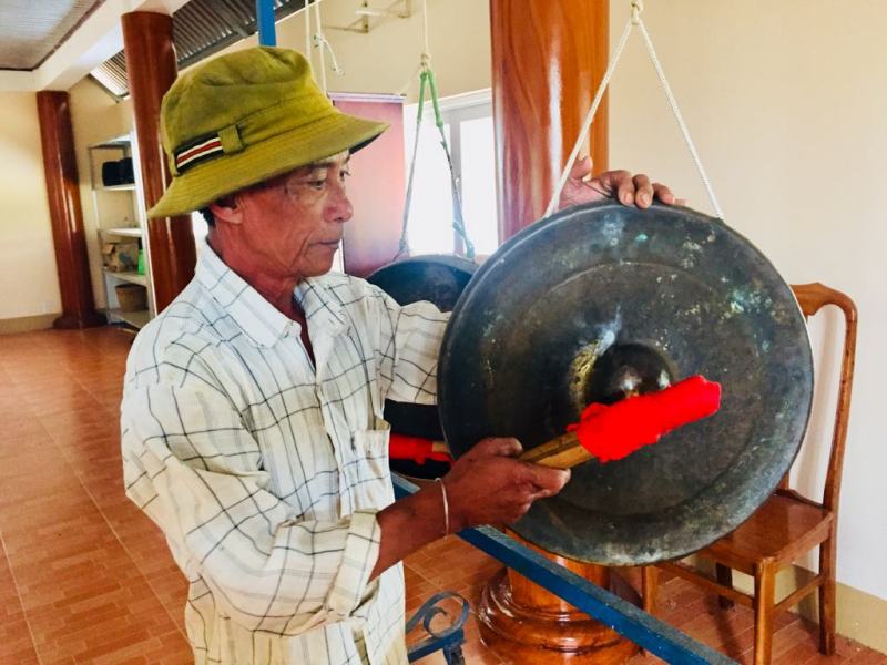 Ông Lý Văn Dương đang đánh chiêng tại Nhà sinh hoạt dân tộc Chơ Ro |