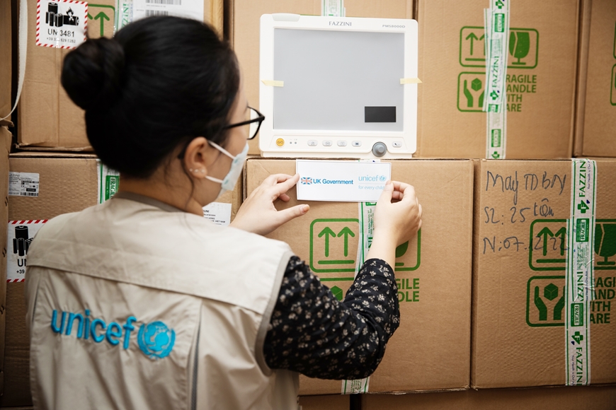 Ảnh: Nhân viên UNICEF bên các thiết bị y tế được trao tặng. Ảnh: qdnd.vn |