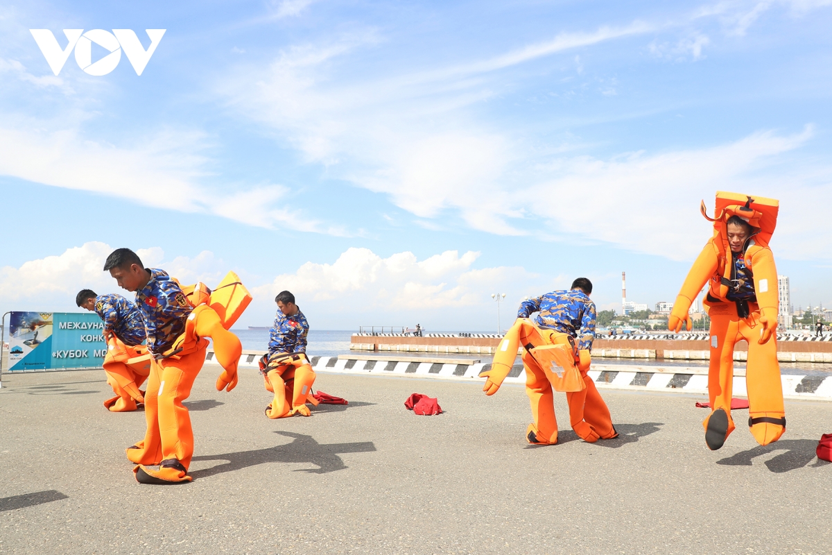 Đội CHCN Hải quân Việt Nam thi đấu nội dung sử dụng thiết bị cứu sinh. ảnh: VOV |