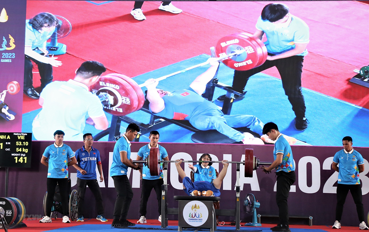 Vận động viên Nguyễn Bình An trong phần thi giành 2 Huy chương Vàng tại ASEAN Para Games 12. Ảnh: Huỳnh Thảo/TTXVN |