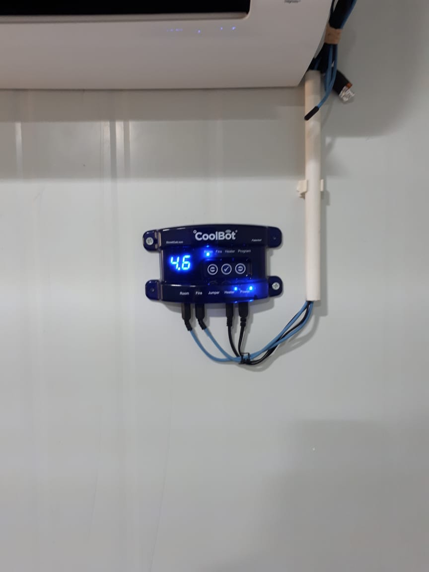 Bộ điều khiển CoolBot kết nối với máy điều hoà không khí giúp đưa nhiệt độ xuống dưới 5 độ C. Một máy điều hoà thông thường khi lắp bộ điều khiển có thể làm mát cho kho hoặc thùng lạnh có thể tích tối đa 30m3. Ảnh: Tuyết Lê |