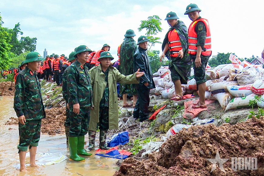 Lãnh đạo Quân khu 1 kiểm tra, chỉ đạo các đơn vị gia cố đê sông Cầu trên địa bàn tỉnh Thái Nguyên. Ảnh mịnh họa Hoàng Dương/ Báo QDND |