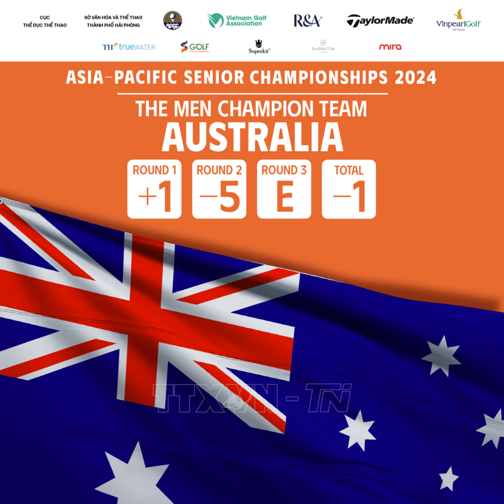 Sau 3 ngày tranh tài sôi động (từ 30-1/11) trên sân Vinpearl Golf Hải Phòng, Đội Australia đã bảo vệ thành công danh hiệu vô địch đồng đội nam và nữ lần thứ 3 liên tiếp tại Giải golf Vô địch trung cao niên châu Á-Thái Bình Dương 2024.