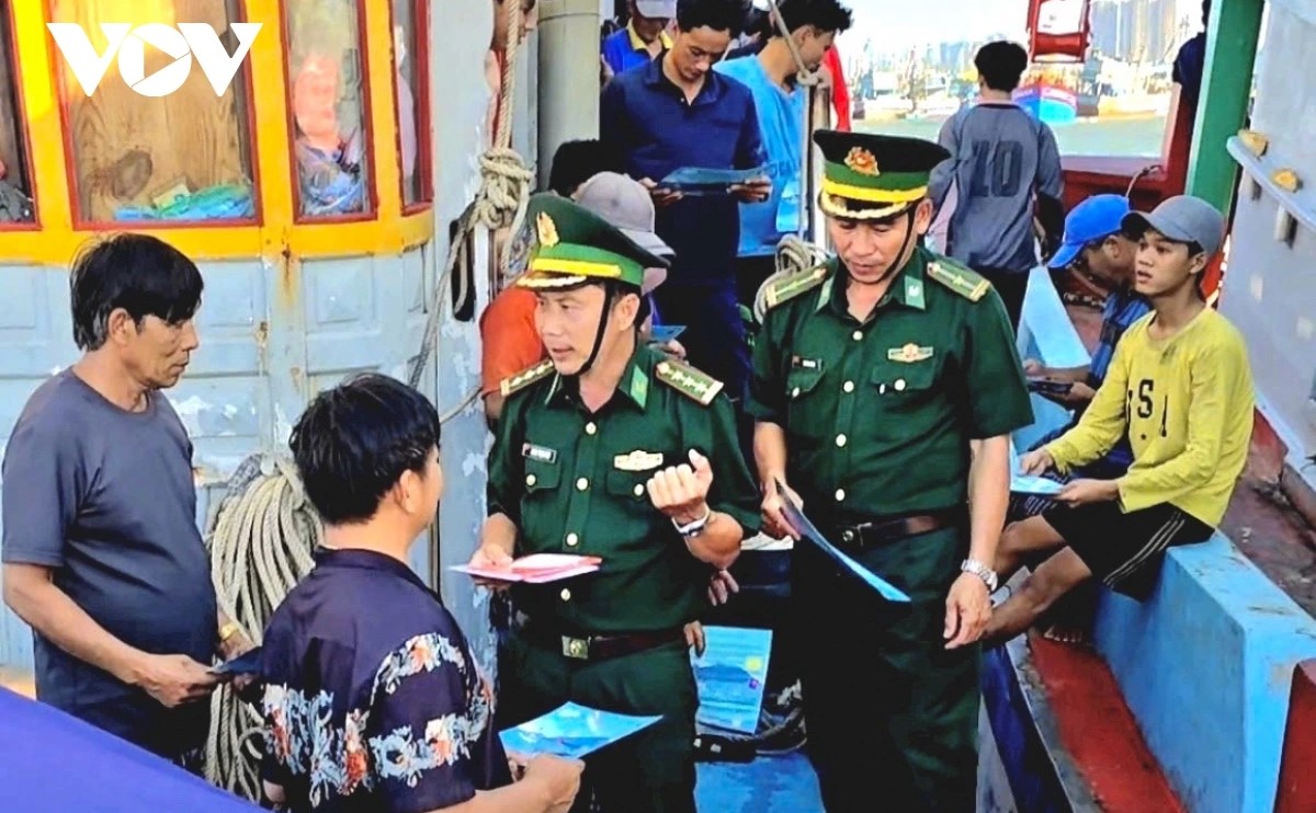 Tổ công tác chuyên biệt của Biên phòng đến tận tàu tuyên truyền cho ngư dân về Luật Thuỷ sản, chống khai thác IUU. Ảnh: VOV |