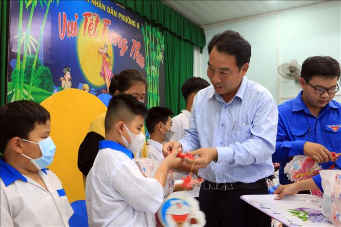 Chủ tịch UBND tỉnh Vĩnh Long Lữ Quang Ngời tặng quà Trung thu cho trẻ em phường 8, thành phố Vĩnh Long. Ảnh: Phạm Minh Tuấn/TTXVN |