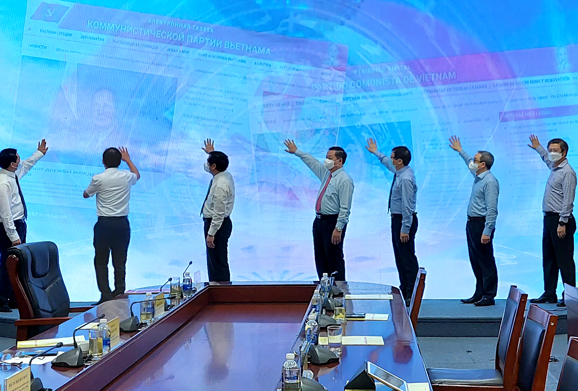 Ông Nguyễn Trọng Nghĩa (giữa), Bí thư Trung ương Đảng, Trưởng Ban Tuyên giáo Trung ương nhấn nút khai trương trang tiếng Nga và tiếng Tây Ban Nha của Báo điện tử Đảng Cộng sản Việt Nam. Ảnh: VGP/Nguyễn Hoàng |