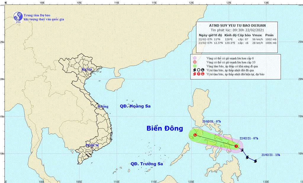 Dự báo, từ 7 giờ ngày 23/2 đến 7 giờ ngày 24/2, vùng áp thấp di chuyển theo hướng Tây Tây Bắc, đi vào Biển Đông sau đó tiếp tục suy yếu thêm. Bão Dujuan không ảnh hưởng đến đất liền Việt Nam, tuy nhiên tác động của áp thấp có khả năng gây gió mạnh trên biển. Mưa dông xuất hiện mạnh ở phần phía Tây, có thể gây nguy hiểm cho tàu thuyền đang hoạt động ở vùng biển phía Đông Nam Biển Đông.