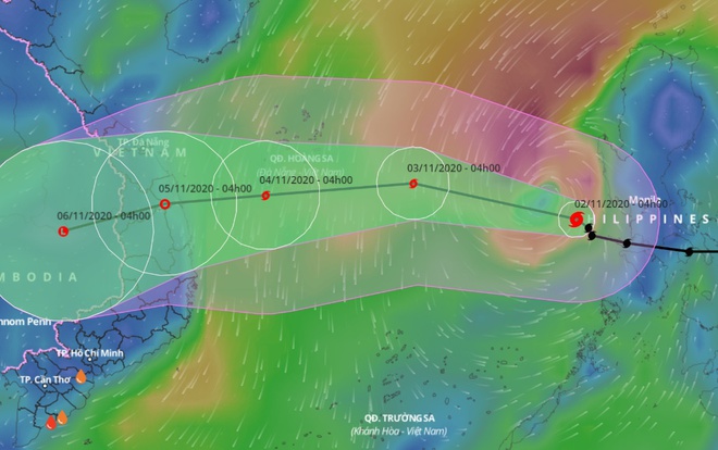 Đến 1 giờ ngày 5/11, vị trí tâm bão ở khoảng 14,7 độ Vĩ Bắc; 109,4 độ Kinh Đông, ngay trên vùng biển từ Đà Nẵng đến Phú Yên. Sức gió mạnh nhất vùng gần tâm bão mạnh cấp 8-9 (60-90 km/giờ), giật cấp 11. Từ 1 giờ ngày 5/11 đến 1 giờ ngày 6/11, bão di chuyển theo hướng Tây Tây Nam, mỗi giờ đi được khoảng 10 km.