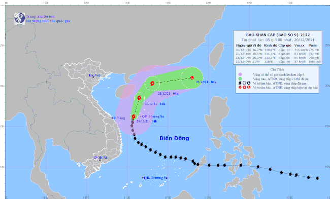 Dự báo, đến 4 giờ ngày 22/12, bão Rai (cơn bão số 9) đổi hướng di chuyển theo hướng Đông Đông Bắc, mỗi giờ đi được 15-20 km và suy yếu thành áp thấp nhiệt đới, sau đó tiếp tục suy yếu thành một vùng áp thấp trên khu vực phía Bắc Biển Đông. Vùng nguy hiểm trên Biển Đông đến 4 giờ ngày 22/12 (gió mạnh từ cấp 6 trở lên, giật từ cấp 8 trở lên): phía Bắc vĩ tuyến 18,0 độ Vĩ Bắc; từ kinh tuyến 110,0 đến 118,0 độ Kinh Đông. Toàn bộ tàu thuyền hoạt động trong vùng nguy hiểm đều có nguy cơ cao chịu tác động của gió mạnh, sóng lớn và lốc xoáy.