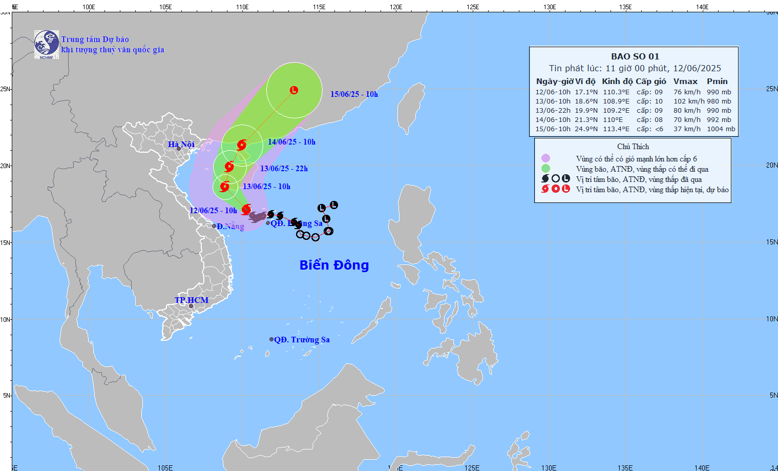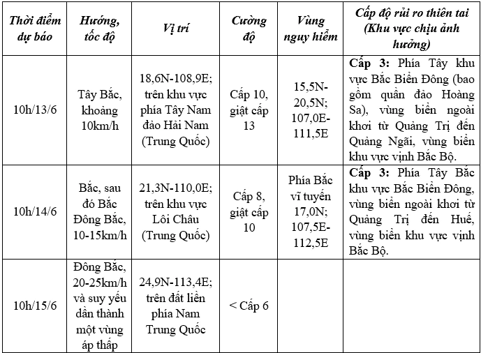Vịnh Bắc Bộ: Từ đêm 12/6, gió sẽ mạnh dần lên cấp 6–7, sau tăng lên cấp 8–9 vùng gần tâm bão, giật cấp 11. Sóng cao phổ biến 2–4m, biển động mạnh.