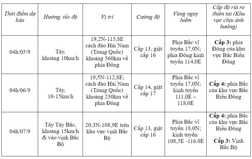 Hồi 4 giờ ngày 4/9, vị trí tâm bão ở vào khoảng 18,9 độ Vĩ Bắc; 118,0 độ Kinh Đông, trên vùng biển phía Đông khu vực Bắc Biển Đông. Sức gió mạnh nhất vùng gần tâm bão mạnh cấp 11 (103-117km/h), giật cấp 13, di chuyển theo hướng Tây Tây Bắc, khoảng 10km/h.