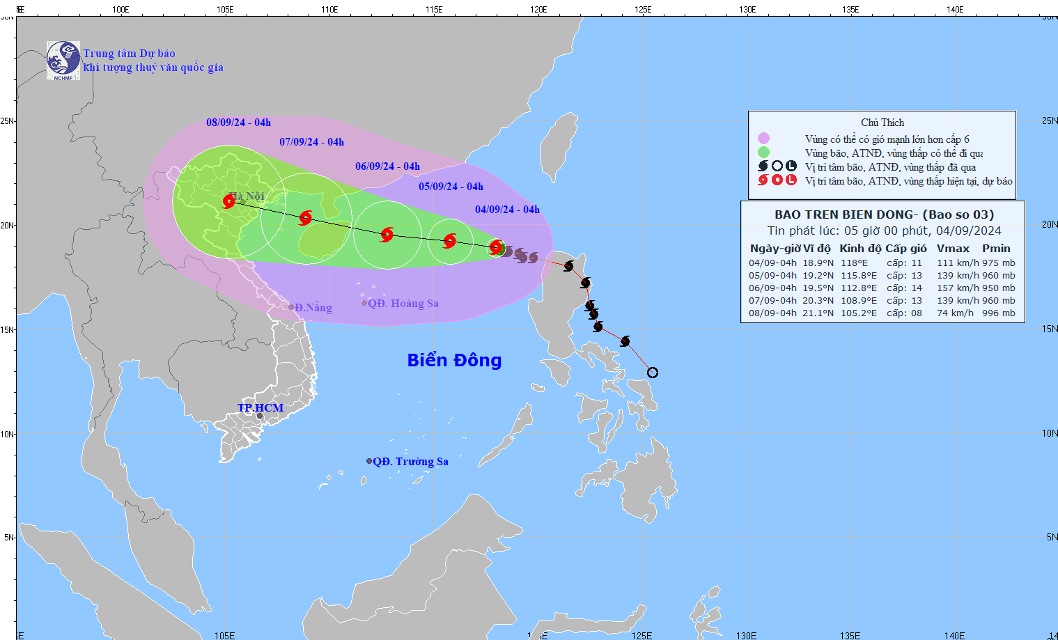 Trên biển: Vùng biển phía Đông của khu vực Bắc Biển Đông có gió mạnh cấp 8-10, vùng gần tâm bão đi qua cấp 11-13, giật cấp 16; biển động dữ dội. Từ ngày 5-6/9, bão số 3 có thể đạt cấp bão rất mạnh trên vùng biển phía Bắc của khu vực Bắc Biển Đông, gió mạnh có thể lên tới cấp 14, giật cấp 17 ở vùng gần tâm bão.