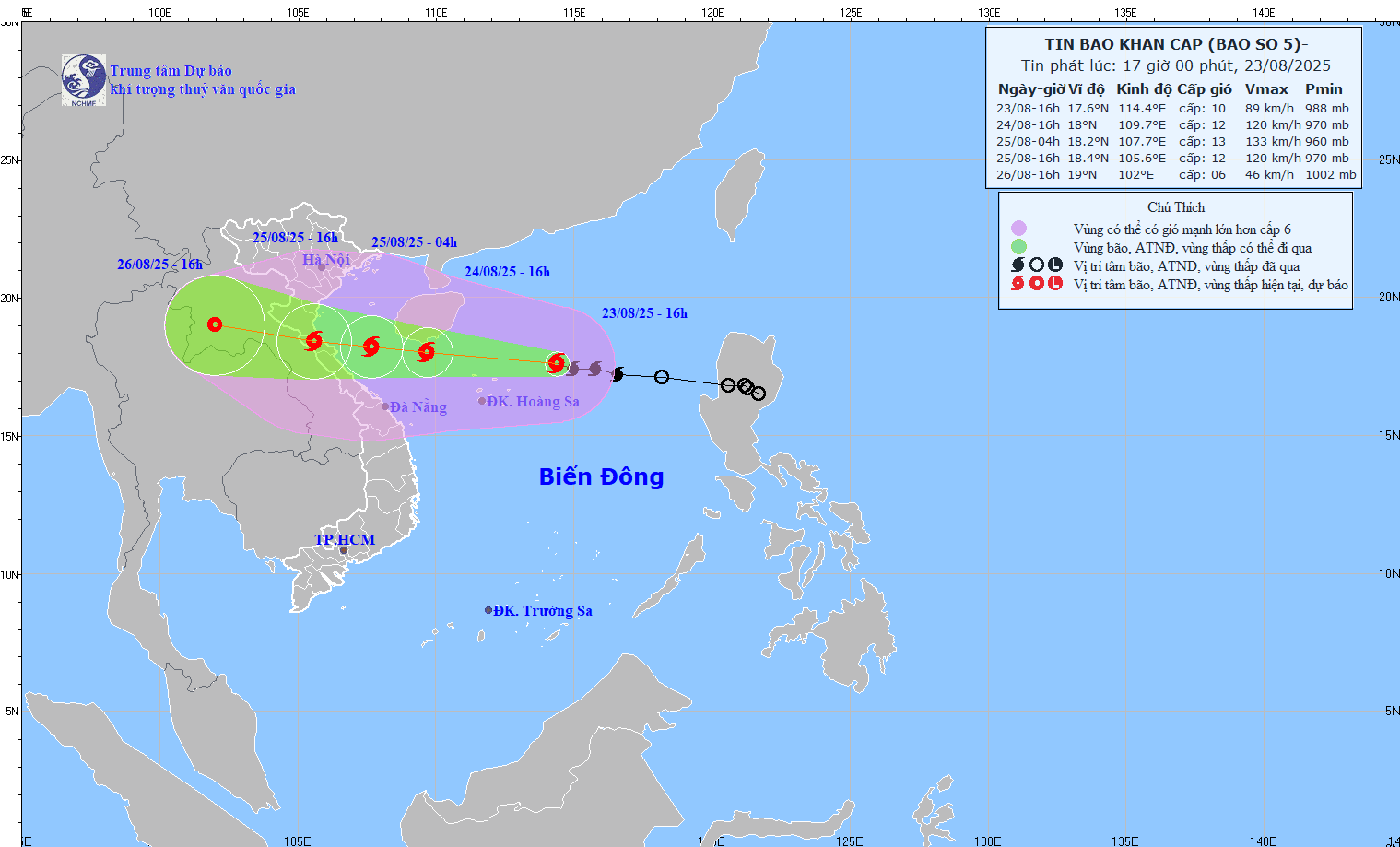 Dự báo vị trí và hướng di chuyển bão số 5 lúc 16h chiều 23/8. Ảnh: NCHMF |