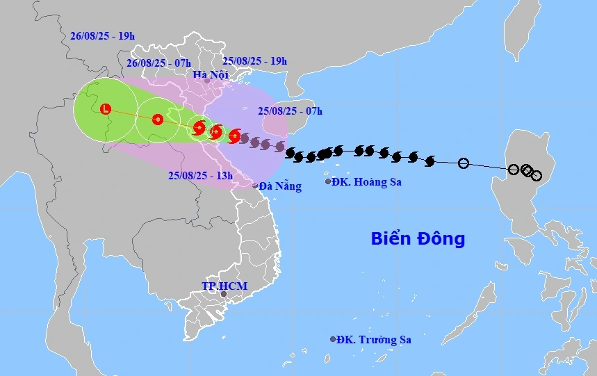 Từ ngày 25-26/8: Trung du, đồng bằng Bắc Bộ, Lào Cai, Thanh Hóa–Huế: 100-150mm, cục bộ >250mm; Thanh Hóa–Bắc Quảng Trị: 200-400mm, cục bộ >600mm.; Hà Nội: mưa vừa, mưa to, có dông; Đà Nẵng (25/8): mưa vừa, có dông; TP.HCM (25-26/8): mưa rào, có dông (tập trung chiều tối). Thượng & Trung Lào (25-27/8): 100-250mm, cục bộ >500mm.