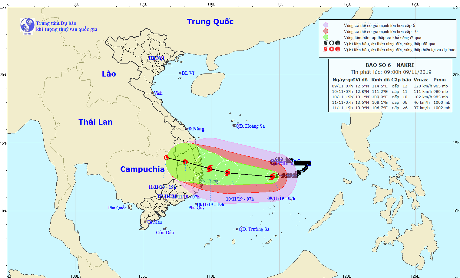 Dự báo trong 24 giờ tới, bão di chuyển chủ yếu theo hướng Tây, mỗi giờ đi được 10-15km. Đến 7 giờ ngày 10/11, vị trí tâm bão ở khoảng 12,8 độ Vĩ Bắc; 111,2 độ Kinh Đông, cách bờ biển các tỉnh từ Quảng Ngãi đến Khánh Hòa khoảng 220km về phía Đông. Sức gió mạnh nhất vùng gần tâm bão mạnh cấp 11 (100-115km/giờ), giật cấp 14.