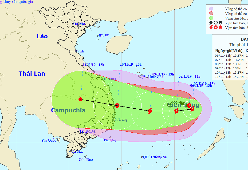 Trong 24h vừa qua và khoảng 12-24 tiếng tới, bão số 6 sẽ di chuyển chậm hoặc hầu như ít di chuyển. Kể từ sáng 7/11, bão số 6 sẽ đổi hướng, quay về phía Việt Nam, hướng về khu vực các tỉnh trung và nam Trung Bộ.