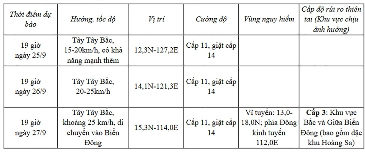 Dự báo, từ tối và đêm 26/9, vùng biển phía Đông khu vực Bắc và Giữa Biển Đông có gió mạnh cấp 6–7, sau tăng lên cấp 8–9, vùng gần tâm bão đi qua cấp 10–11, giật cấp 14. Sóng biển cao 5,0–7,0m. Biển động dữ dội. Đặc biệt nguy hiểm đối với tàu thuyền hoạt động trên khu vực Bắc và Giữa Biển Đông.