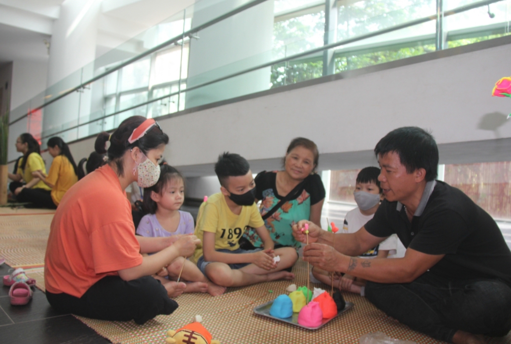 Nghệ nhân hướng dẫn các em nhỏ nặn tò he. - Ảnh Ngọc Anh |