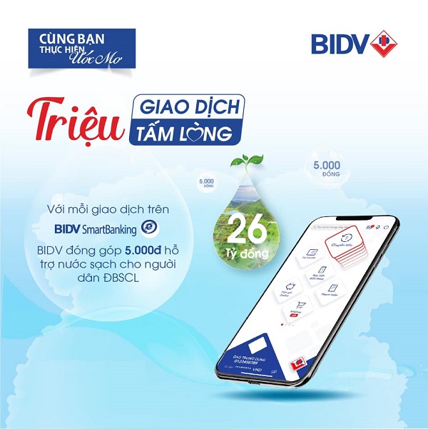 Ngày 27/4, Ngân hàng TMCP Đầu tư và Phát triển Việt Nam (BIDV) phát động chương trình "Nước ngọt cho cuộc sống Xanh" tại 5 tỉnh khu vực Đồng bằng sông Cửu Long với tổng số tiền đóng góp dự kiến 26 tỷ đồng. Theo đó, với mỗi giao dịch chuyển tiền khác chủ tài khoản trên kênh ngân hàng điện tử BIDV SmartBanking, BIDV sẽ đóng góp 5.000 đồng từ nguồn chi phí của ngân hàng để tặng bồn nước và máy lọc nước cho người dân tại các tỉnh Long An, Tiền Giang, Bến Tre, Kiên Giang và Cà Mau. Chương trình được triển khai từ nay đến ngày 12/5/2020. Dự kiến sẽ có khoảng 13.300 hộ dân được tặng bồn chứa nước và 39 điểm dân cư được sử dụng nước ngọt từ 39 máy lọc nước công suất lớn do BIDV tài trợ.