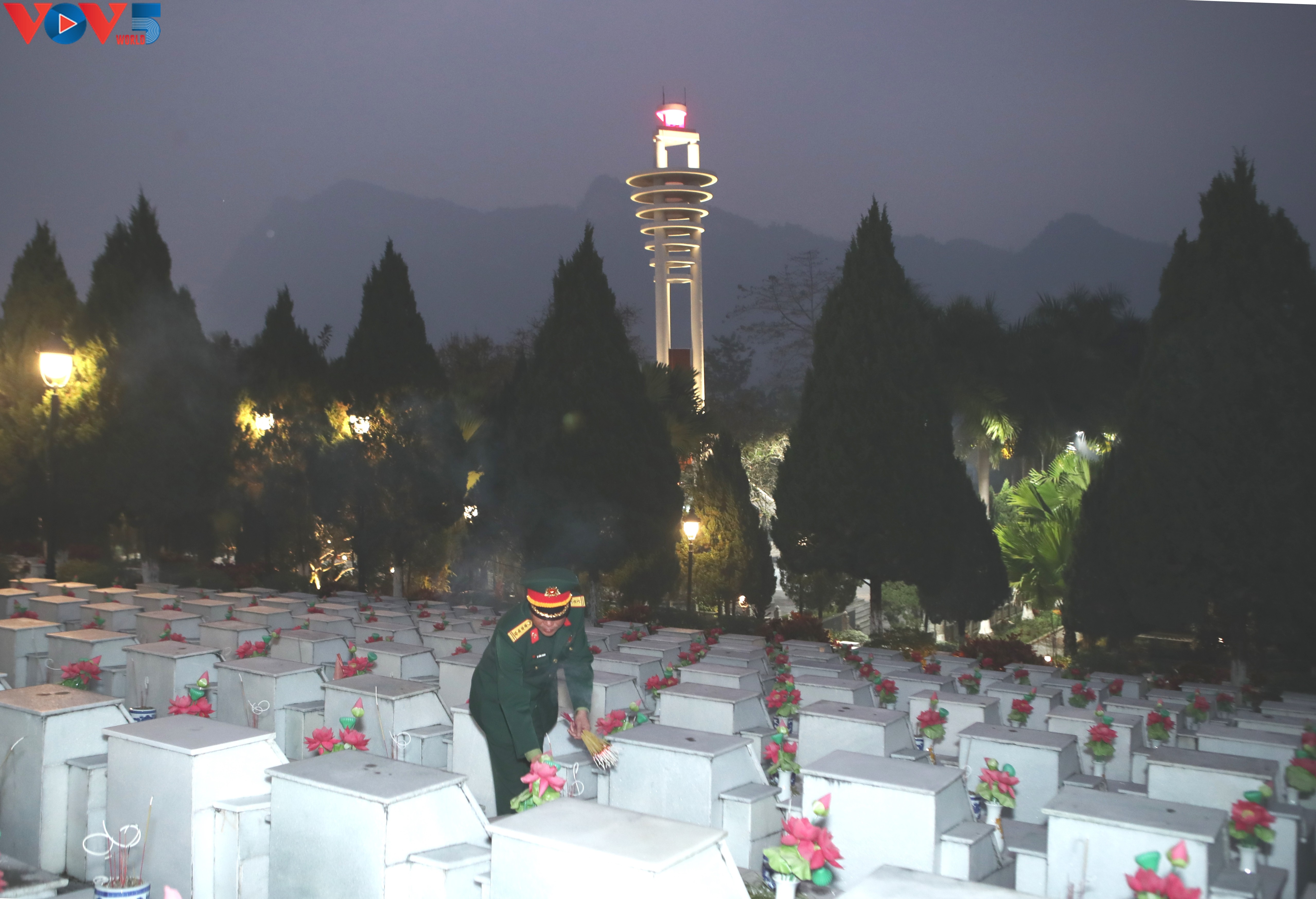 Chiều cùng ngày, đoàn công tác đã đến dâng hương, dâng hoa tại Nghĩa trang Liệt sĩ Quốc gia Vị Xuyên, nơi yên nghỉ của hơn 1.700 anh hùng liệt sĩ đã anh dũng hy sinh trong các cuộc kháng chiến bảo vệ Tổ quốc. Trong không khí trang nghiêm, thành kính, các cán bộ, chiến sĩ Binh chủng Đặc công bày tỏ lòng biết ơn đối với những người con ưu tú của dân tộc, những người đã hiến dâng trọn tuổi xuân và máu xương cho độc lập, tự do của đất nước.
