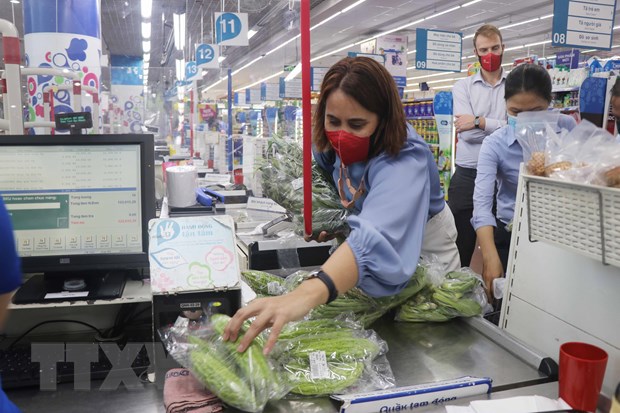 Đại sứ New Zealand tại Việt Nam Tredene Dobson mua rau an toàn thương hiệu 'Lá Lành' tại siêu thị Co.op Mark Quy Nhơn do nông dân Bình Định sản xuất từ dự án Rau an toàn Bình Định. Ảnh: Kha Phạm/TTXVN |