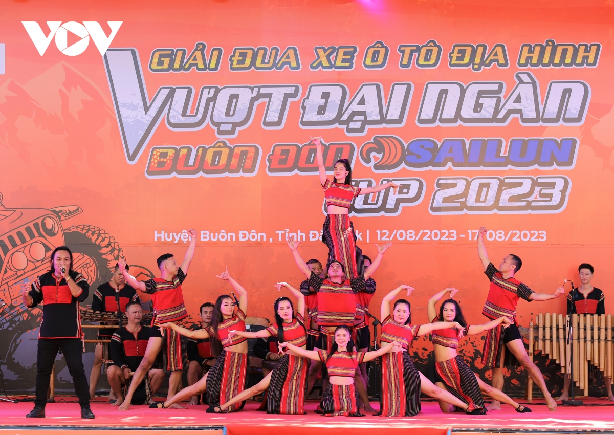 Lễ khai mạc Giải đua xe ô tô địa hình Vượt đại ngàn Buôn Đôn 2023 diễn ra trang trọng, đậm bản sắc văn hóa địa phương. Ảnh: VOV |