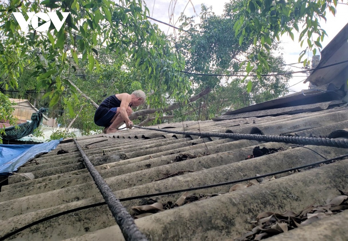 Người dân xã Tam Hải, huyện Núi Thành, tỉnh Quảng Nam chằng chống nhà cửa.- Ảnh: VOV |