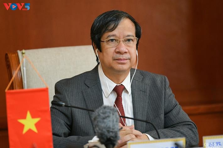 Trong bài phát biểu đối thoại tại hội nghị, Bộ trưởng Bộ Giáo dục và Đào tạo (GDĐT) Việt Nam Nguyễn Kim Sơn chia sẻ những tác động của đại dịch Covid-19 tới giáo dục Việt Nam và những thay đổi để thích ứng, trong đó chủ trương “tạm dừng đến trường, không ngừng việc học”, đã được thực hiện hiệu quả thông qua các hình thức dạy học qua Internet, trên truyền hình phù hợp trong điều kiện dịch bệnh. Qua đó, thúc đẩy mối quan hệ giữa học sinh và giáo viên, tương tác giữa giáo viên với gia đình và cộng đồng.