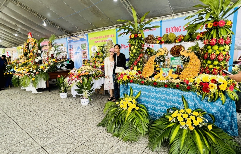 Không gian “Tạo hình nghệ thuật từ hoa và trái cây” và Trưng bày trái cây ngon Phong Điền thu hút du khách tham quan, chụp ảnh. Ảnh: VOV |
