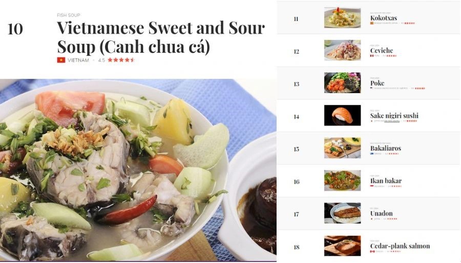 Hôm qua (15/7), trang hướng dân du lịch trực tuyến Taste Atlas công bố danh sách 57 món ngon nhất làm từ cá trên thế giới, canh chua cá của Việt Nam đứng thứ 8. Canh chua ngọt xếp thứ 19 và lẩu cá linh điên điển xếp thứ 53.