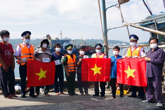 Tại đây, lực lượng Cảnh sát biển cùng các nhà đồng hành đã trao tặng cho ngư dân trên các tàu, thuyền đang neo đậu âu cảng 100 lá cờ Tổ quốc, 1.500 khẩu trang, 100 chai dung dịch khử khuẩn, 20 áo phao và phao các loại, 60 cuốn sổ tay tuyên truyền. Những món quà mang ý nghĩa thiết thực được vận chuyển vượt quãng đường dài trên biển để đến với nhân dân và học sinh trên đảo Bạch Long Vĩ, thể hiện niềm tin, sự gửi gắm tình cảm từ đất liền dành cho nhân dân nơi đảo tiền tiêu của Tổ quốc.