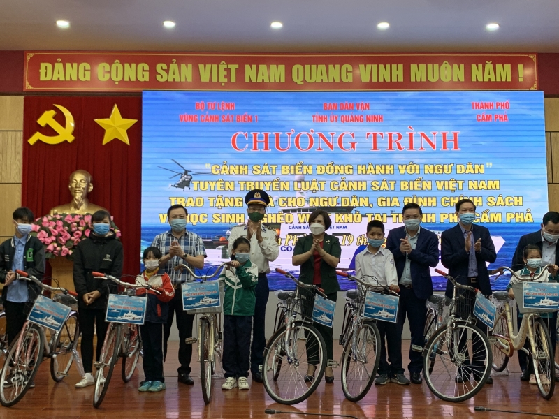 Dịp này, Bộ Tư lệnh vùng Cảnh sát biển 1 cùng các đơn vị đồng hành đã trao tặng 50 suất quà, cho ngư dân, gia đình chính sách bị ảnh hưởng bởi dịch Covid-19 cùng 100 lá cờ Tổ quốc cho ngư dân. 10 em học sinh nghèo con ngư dân vượt khó tại thành phố Cẩm Phả được trao tặng học bổng, xe đạp, đồ dùng học tập trị giá hơn 100 triệu đồng.