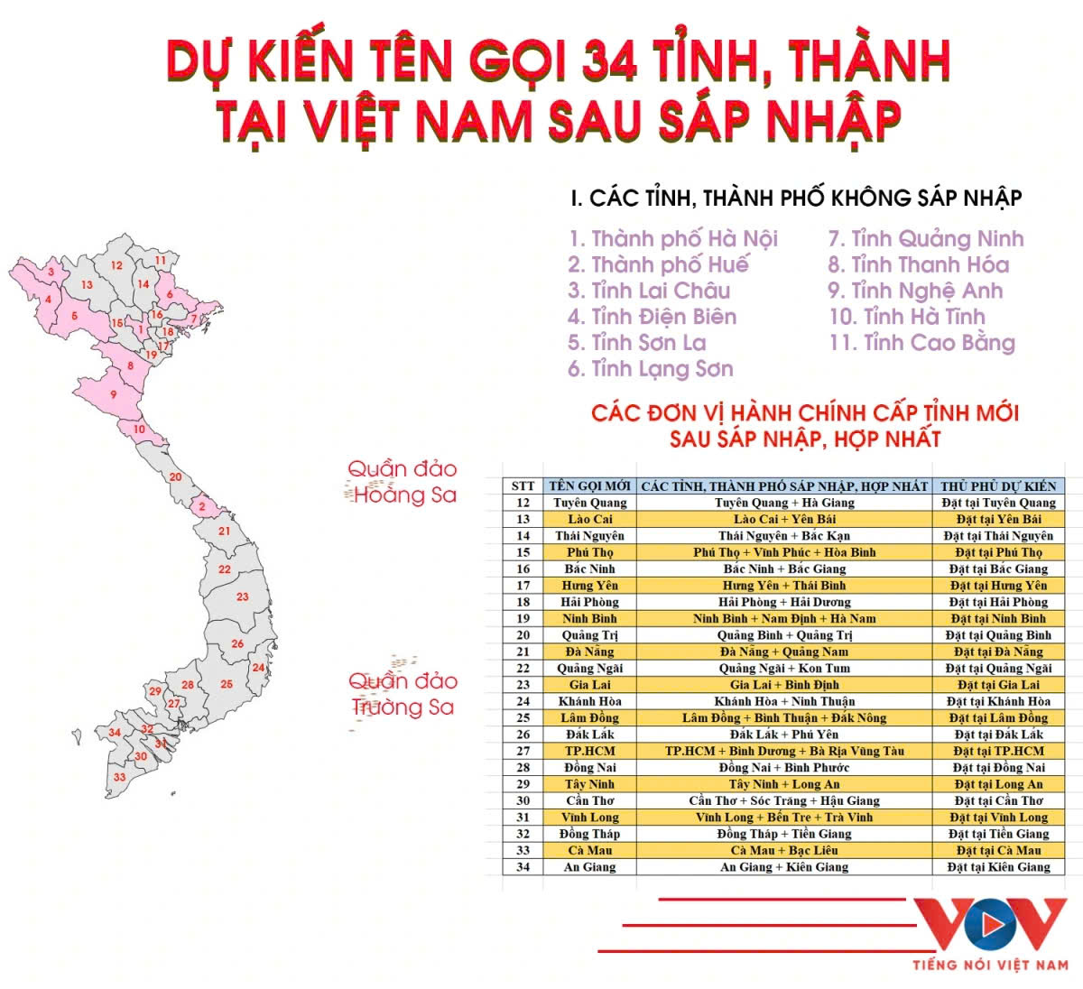 (VOV5) - Đây là danh sách dự kiến tên gọi các tỉnh, thành phố và trung tâm chính trị - hành chính (tỉnh lỵ) của 34 đơn vị hành chính cấp tỉnh sau khi sáp nhập, hợp nhất.