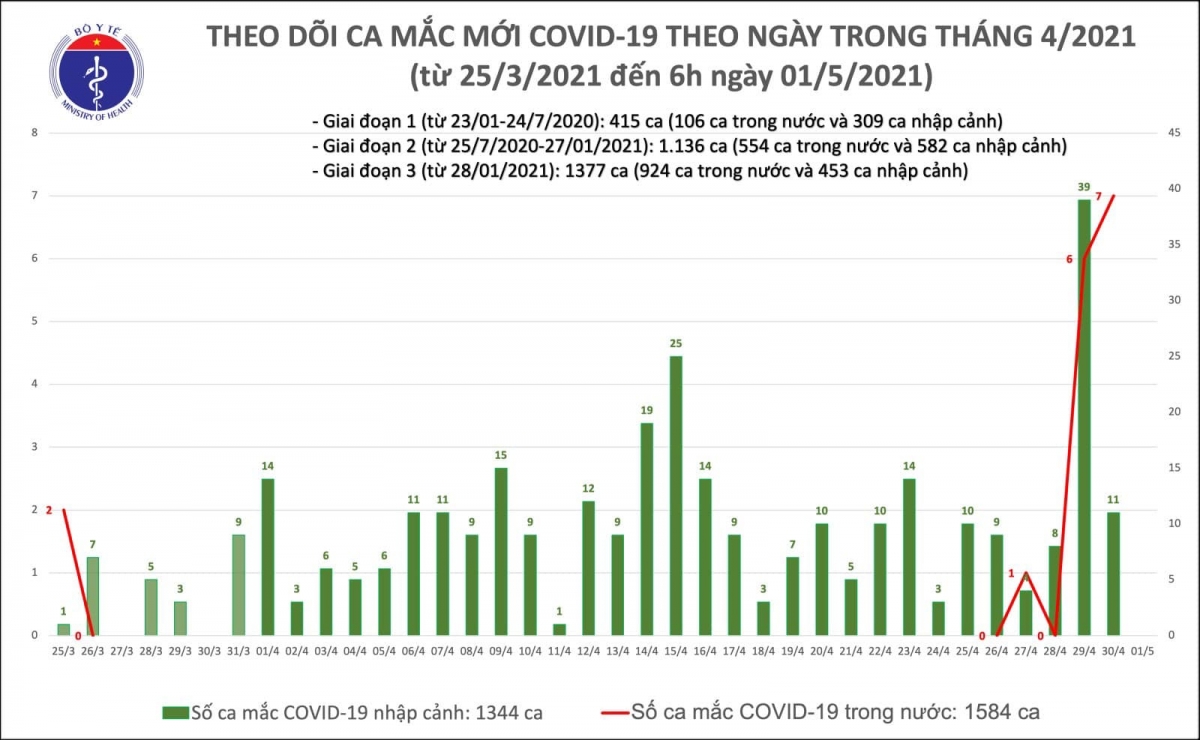 Bộ Y tế cho biết, tính đến 18h ngày 01/5: Việt Nam có tổng cộng 1587 ca mắc COVID-19 do lây nhiễm trong nước, trong đó số lượng ca mắc mới tính từ ngày 27/1 đến nay: 927 ca.