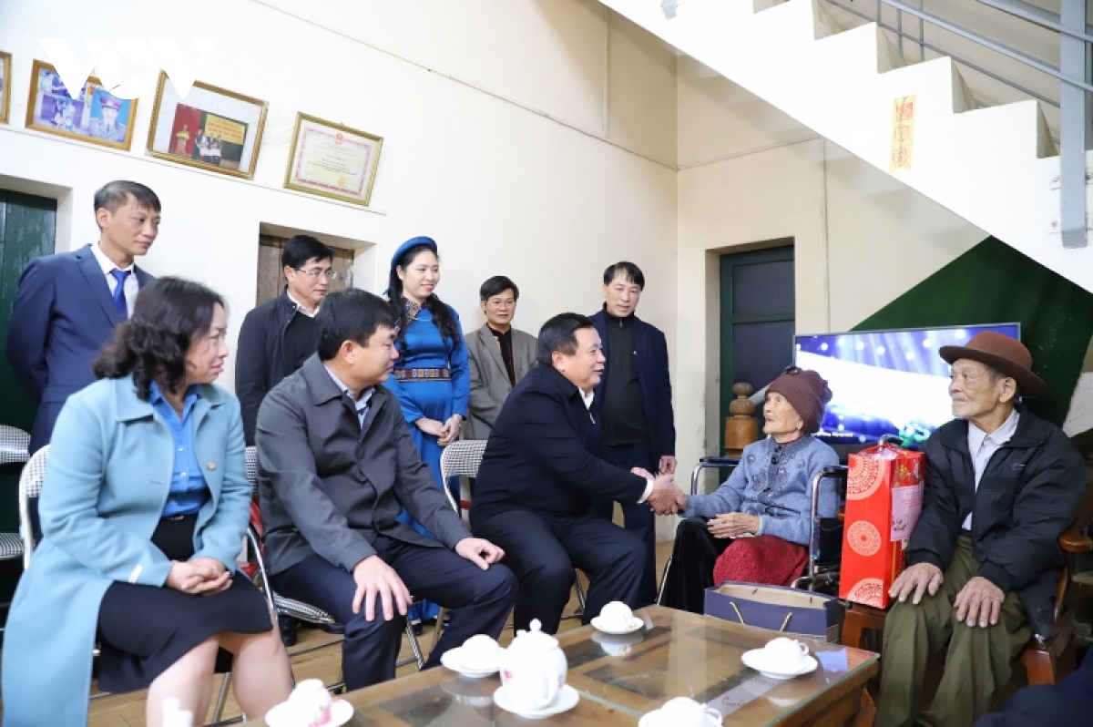 Ông Nguyễn Xuân Thắng hỏi thăm sức khỏe, tặng quà, chúc Tết Mẹ Việt Nam Anh hùng Hoàng Thị Sinh (xã Vô Ngại, huyện Bình Liêu, tỉnh Quảng Ninh) - Ảnh: VOV |