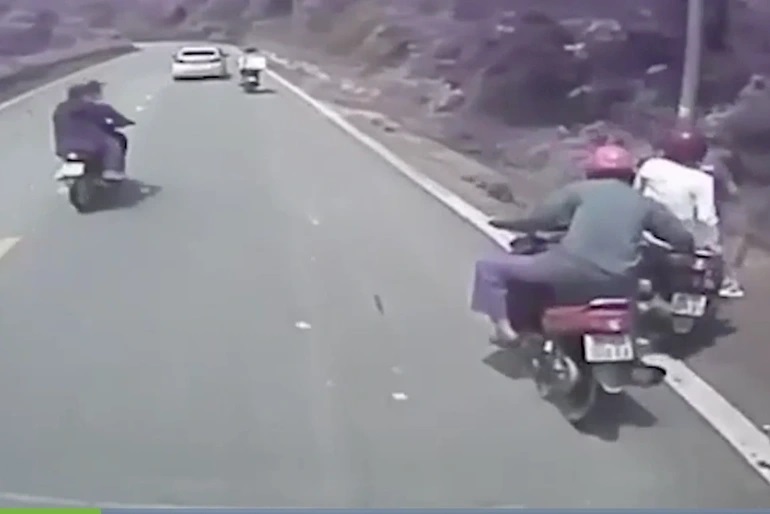 Anh Đinh Văn Chiến dũng cảm kéo xe máy bị mất phanh đang lao vun vút trên đèo Tam Đảo để 3 người ngồi trên xe an toàn. Ảnh cắt từ clip: dantri.com |