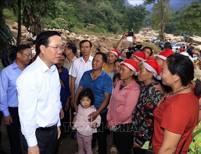 Chủ tịch nước Võ Văn Thưởng kiểm tra công tác khắc phục mưa lũ tại thị xã Sapa, Lào Cai. (Ảnh: TTXVN) |