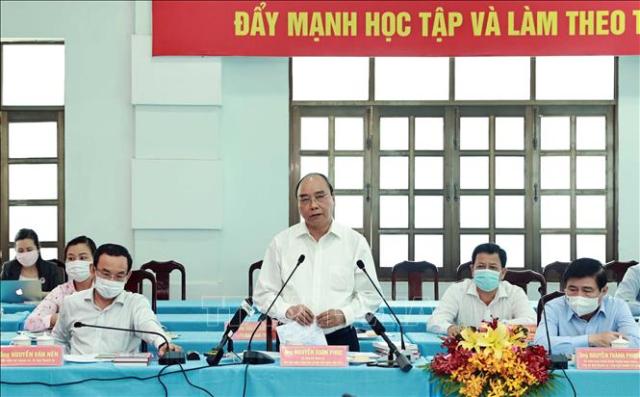 Chủ tịch nước Nguyễn Xuân Phúc phát biểu tại buổi làm việc với các huyện Củ Chi và Hóc Môn ngày 6/5. Ảnh: Thống Nhất/TTXVN |