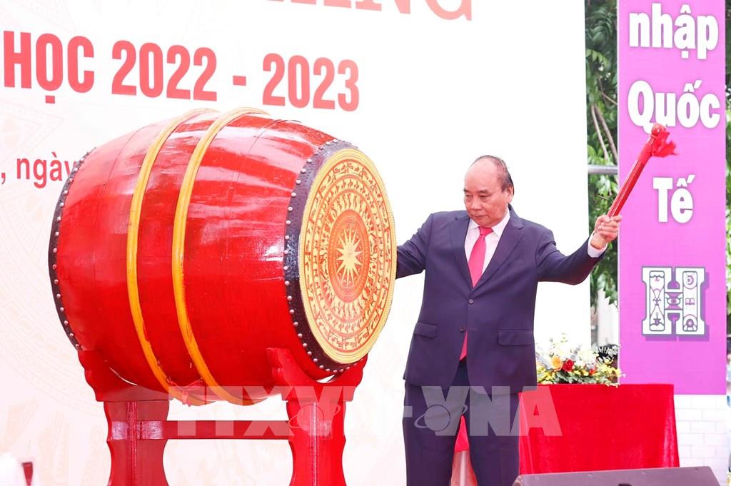 Chủ tịch nước Nguyễn Xuân Phúc đánh trống khai giảng năm học 2022-2023 của Trường THPT Chuyên Khoa học Tự nhiên. Ảnh: TTXVN |