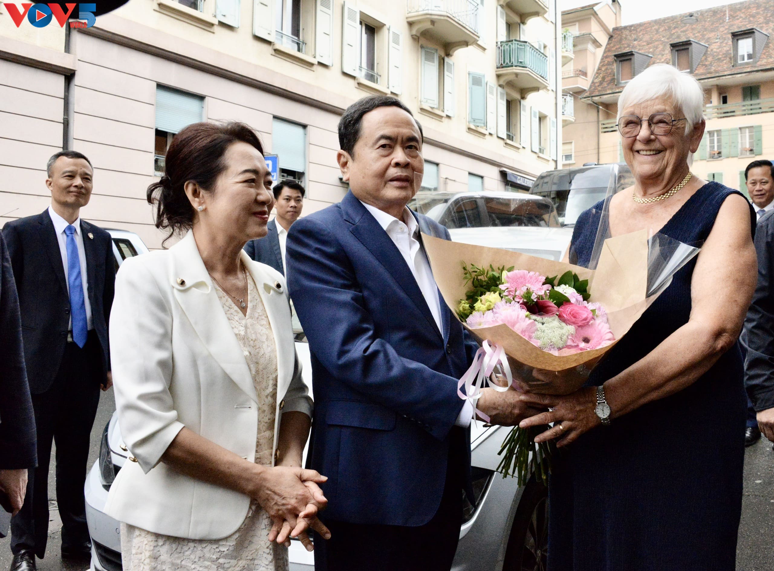 Chủ tịch Quốc hội Trần Thanh Mẫn và phu nhân tới thăm gia đình ông bà Jacques Savary. Ảnh: Lê Tuyết/VOV |