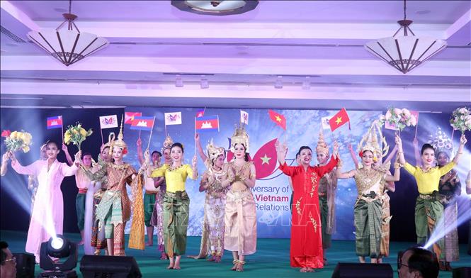 Tiết mục ca múa ca ngợi tình đoàn kết Việt Nam - Campuchia. Ảnh: TTXVN |