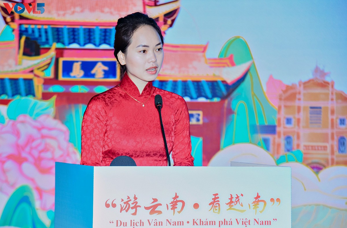 Đại diện Tổng Lãnh sự quán Việt Nam tại Côn MiBà Trương Thanh Thanh, Đại diện Tổng Lãnh sự quán Việt Nam tại Côn Minh phát biểu. Ảnh: VOV5nh, bà Trương Thanh Thanh phát biểu: "Chương trình "Tìm kiếm Dấu chân Bác tại Vân Nam" và tuyến du lịch đỏ nghiên cứu học tập hai chiều "Du lịch Vân Nam - Khám phá Việt Nam" chính là thực tiễn sinh động kế thừa truyền thống cách mạng lâu đời giữa hai nước. 85 năm trước, trên mảnh đất Vân Nam, Chủ tịch Hồ Chí Minh đã gặp gỡ các nhà cách mạng của Việt Nam như Phạm Văn Đồng, Võ Nguyên Giáp để bàn về những sự kiện trọng đại của cách mạng Việt Nam. Những năm tháng ở Vân Nam của Người không chỉ có ý nghĩa với lịch sử đấu tranh giành độc lập và tự do của dân tộc Việt Nam, mà còn là chứng tích cho sự ủng hộ lẫn nhau của hai nước Trung Quốc và Việt Nam trong những năm tháng cách mạng gian khổ."