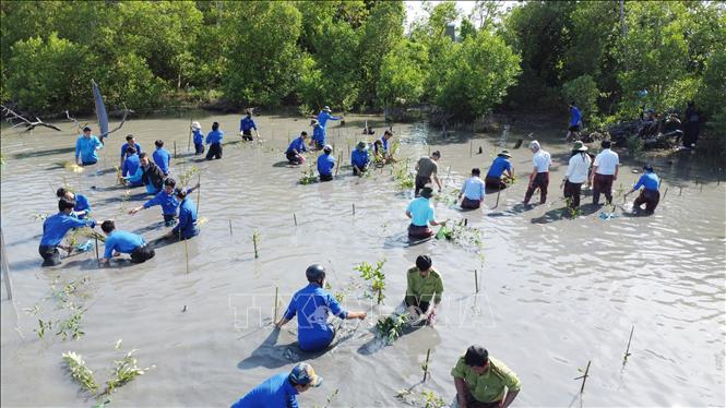 150 đoàn viên thanh niên tích cực tham gia trồng cây xanh để góp phần hướng đến mục tiêu "Vì một Việt Nam xanh". Ảnh: TTXVN |