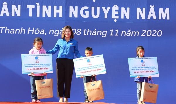Chị Đỗ Thị Kim Hoa, Giám đốc Trung tâm Tình nguyện Quốc gia, trao biển tượng trưng hỗ trợ xây dựng nhà hạnh phúc cho 03 em học sinh mồ côi, có hoàn cảnh đặc biệt khó khăn vươn lên trong học tập. |
