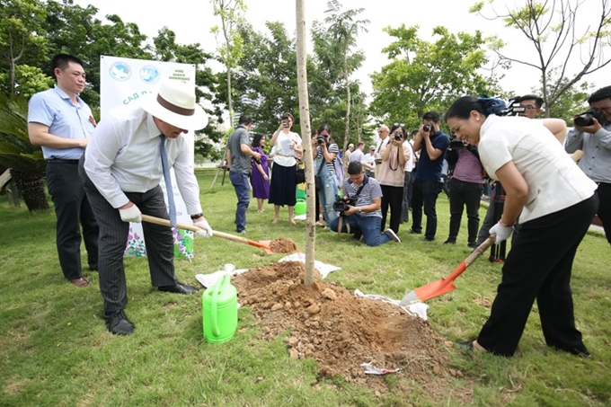 Đại sứ Liên bang Nga tại Việt Nam Konstantin Vnukov và Chủ tịch Liên hiệp các tổ chức hữu nghị Việt Nam Nguyễn Phương Nga trồng cây (Ảnh: KL) |