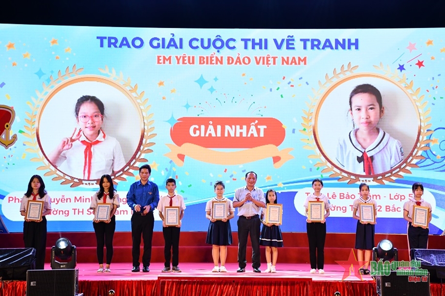 Lãnh đạo tỉnh Quảng Bình, Tỉnh Đoàn Quảng Bình trao thưởng cho các học sinh đạt giải cuộc thi vẽ tranh “Em yêu biển, đảo Việt Nam” - Ảnh: Minh Tú/qdnd.vn |