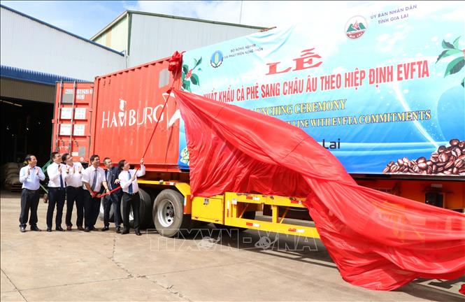 Ngày 16/9/2020, tại Gia Lai, lô cà phê đầu tiên của Việt Nam đã chính thức xuất khẩu sang thị trường EU theo Hiệp định thương mại tự do giữa Việt Nam và Liên minh châu Âu (EVFTA) - Ảnh: Hồng Điệp/TTXVN |
